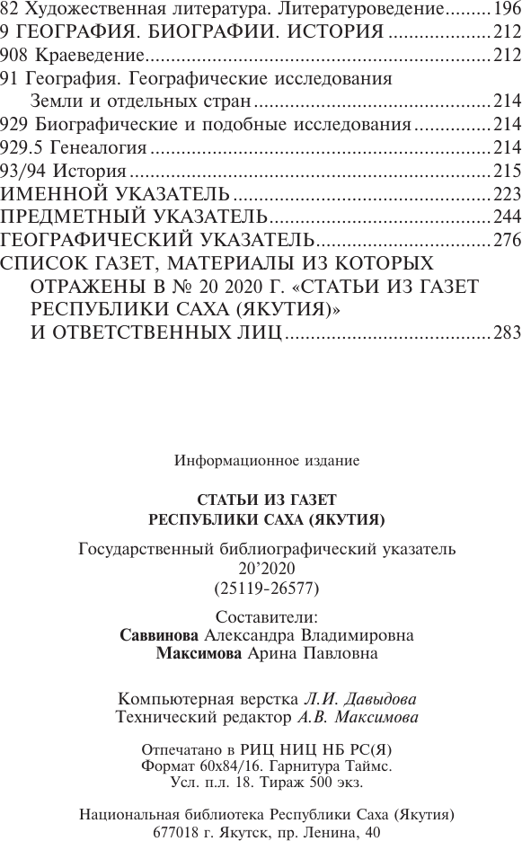 2020, N 9 (10733-12337), 2020, N 9 (10733-12337), 2020 - 3. Статьи из газет Республики Саха (Якутия) = Саха Өрөспүүбүлүкэтин хаһыаттарыгар киирбит ыстатыйалар: государственный библиографический указатель