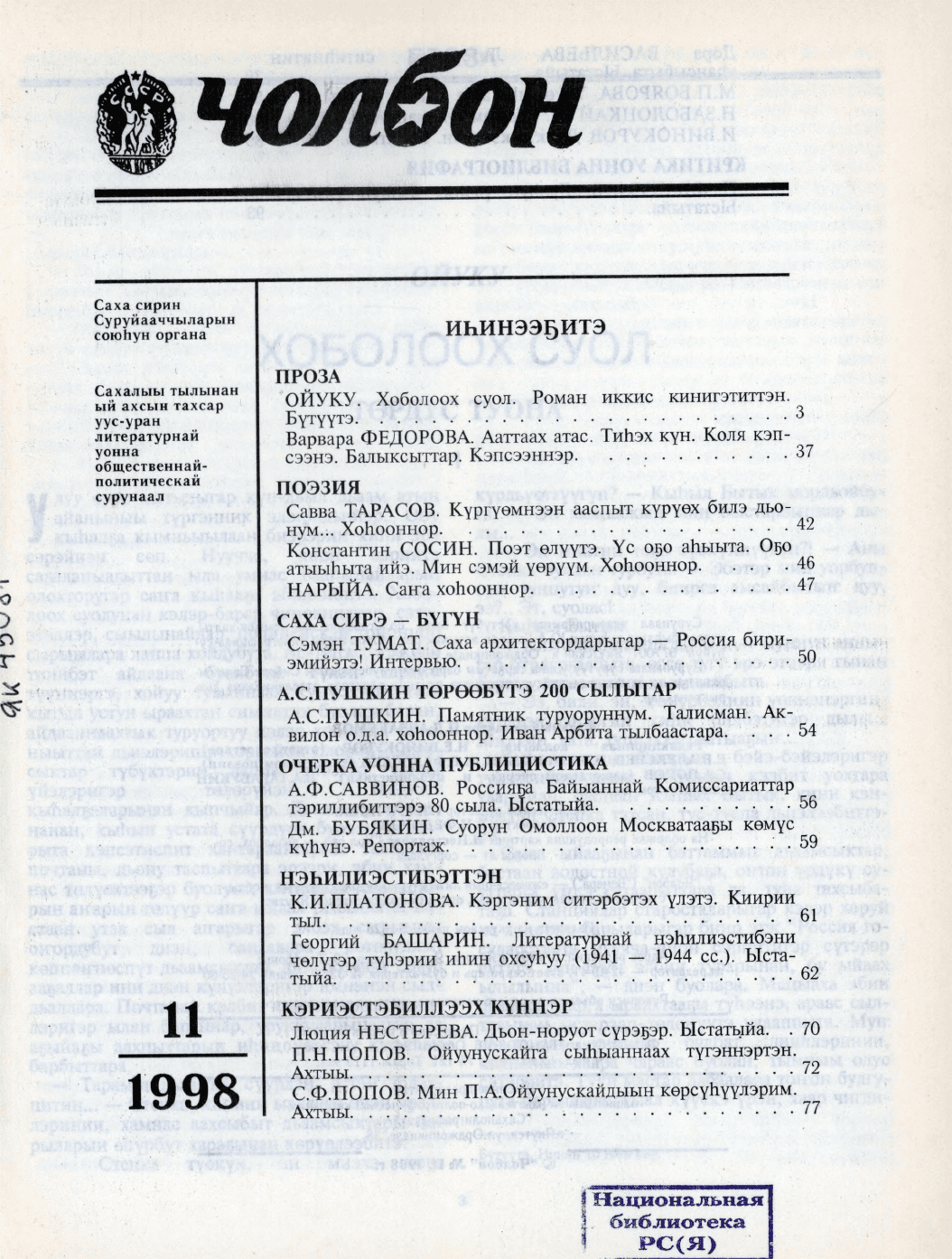 - 10. Чолбон: уус-уран литературнай уонна общественнай-политическай сурунаал, 1998, №10
