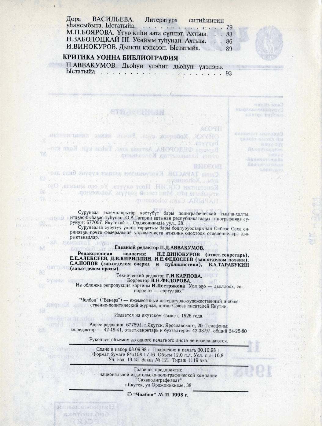 - 2. Чолбон: уус-уран литературнай уонна общественнай-политическай сурунаал, 1998, №2