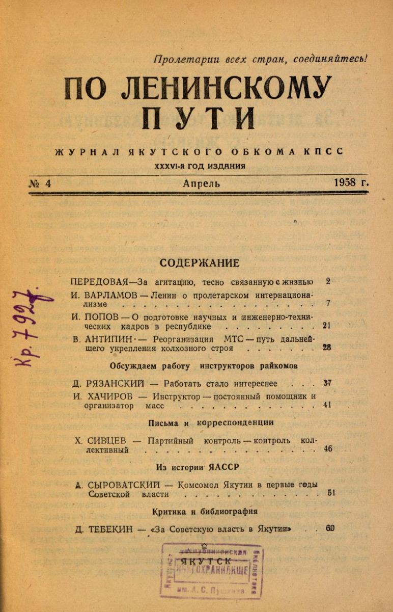 По Ленинскому пути : журнал Обкома ВКП(б). - Якутск, 1922-1964.