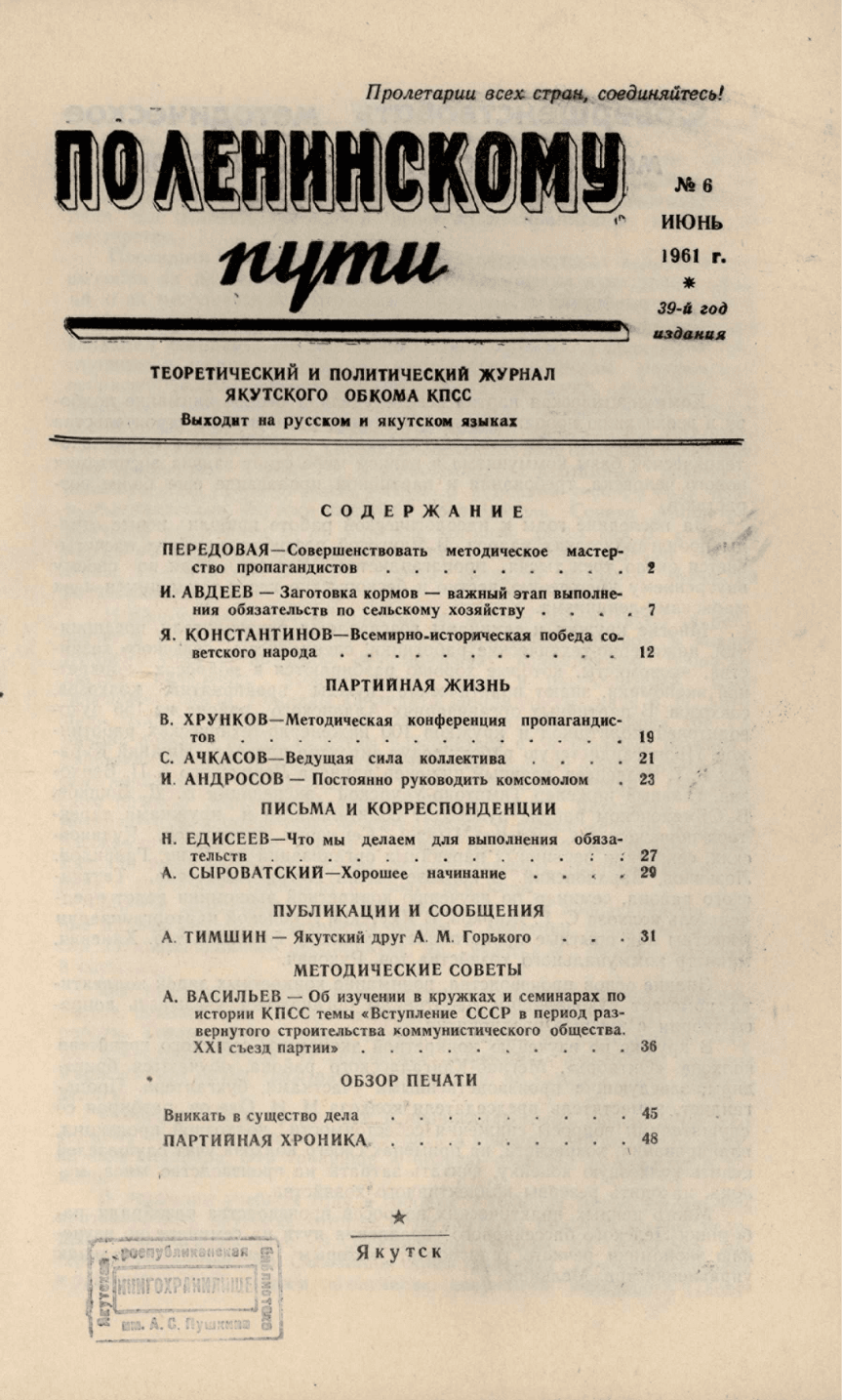 По Ленинскому пути : журнал Обкома ВКП(б) / . - Якутск : , 1922-1964.