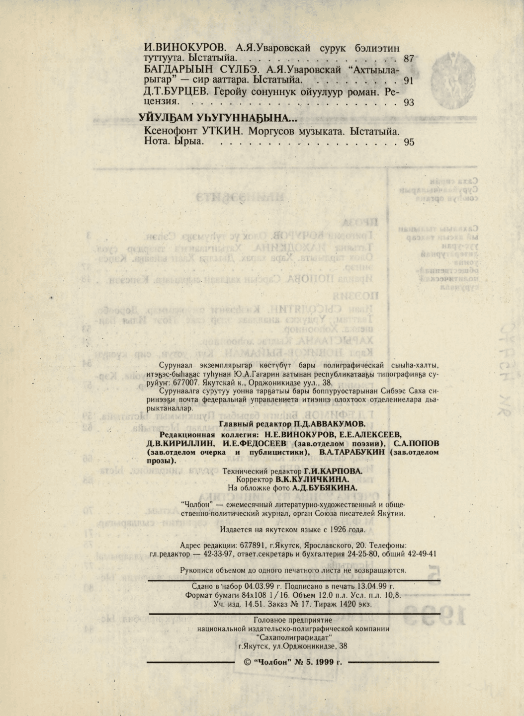 - 5. Чолбон: уус-уран литературнай уонна общественнай-политическай сурунаал, 1999, №6