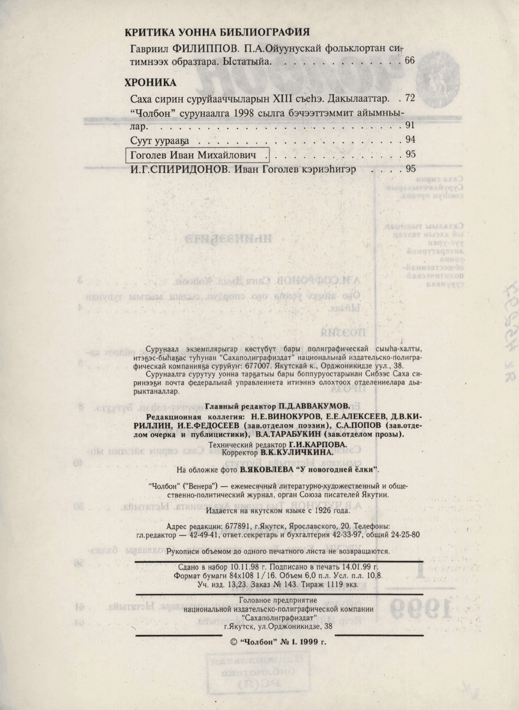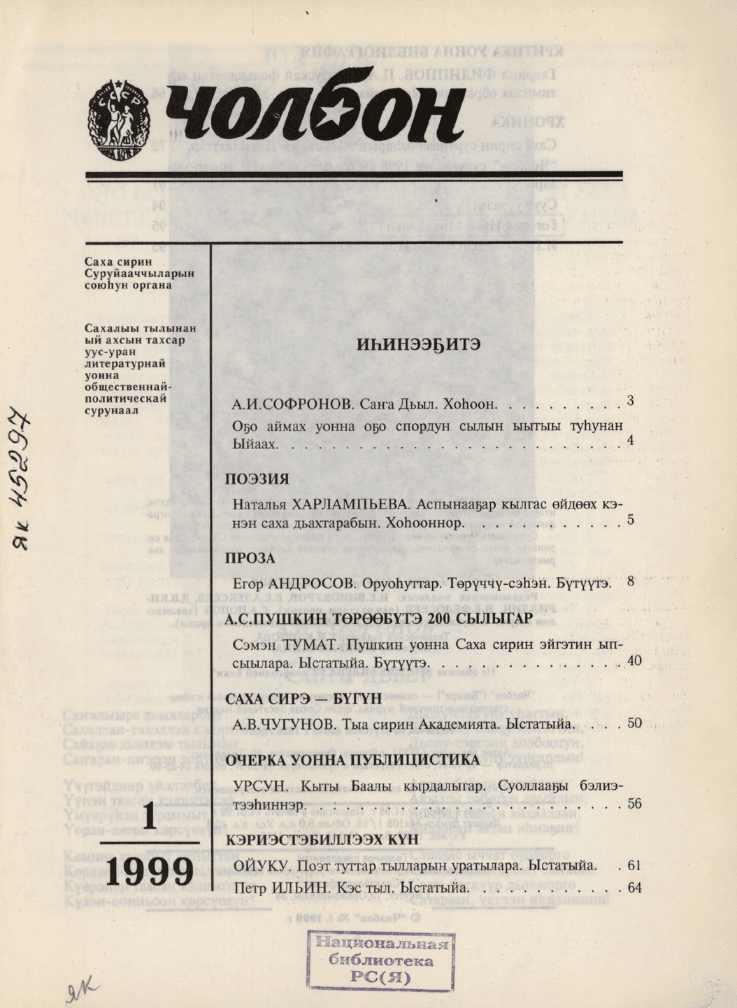 - 2. Чолбон: уус-уран литературнай уонна общественнай-политическай сурунаал, 1999, №3