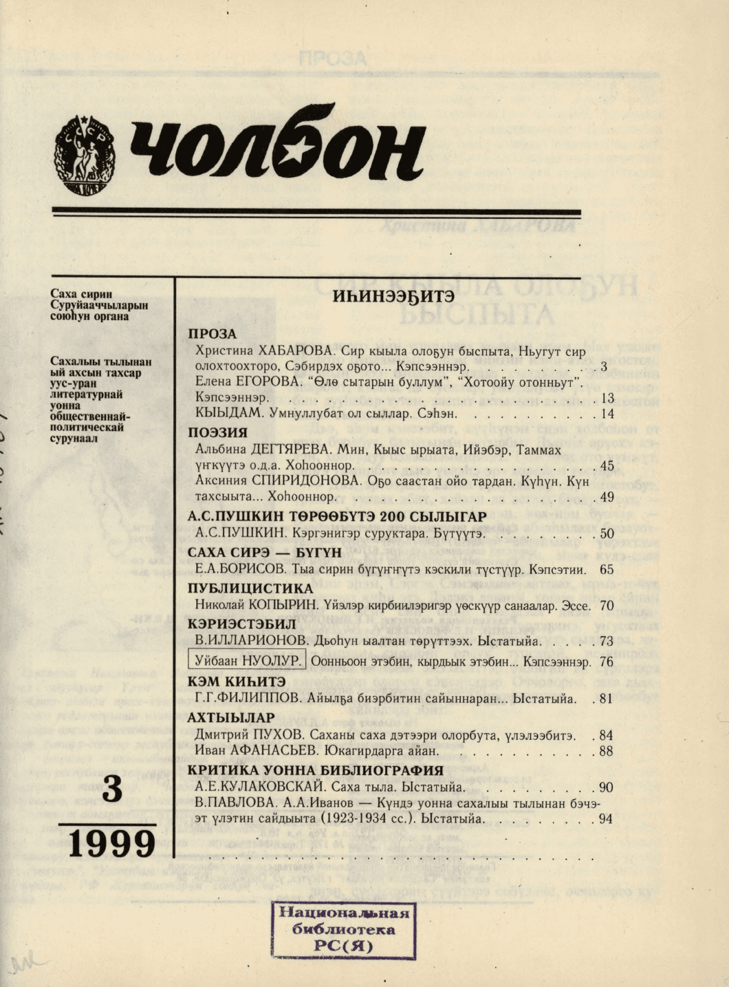 - 2. Чолбон: уус-уран литературнай уонна общественнай-политическай сурунаал, 1999, №2