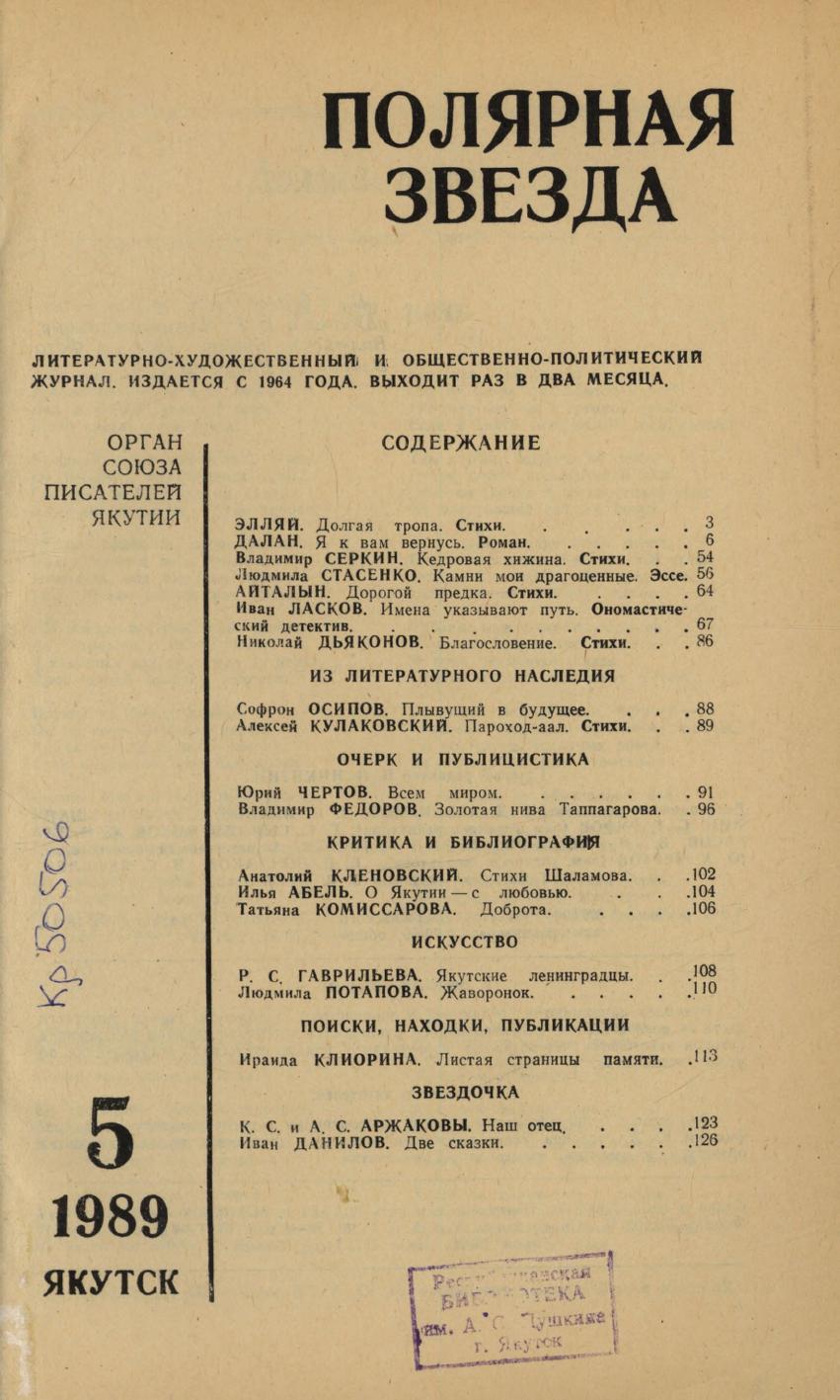 - Периодические издания Якутии (конец XIX – XXI вв.) > Журналы > Полярная звезда > 1989,