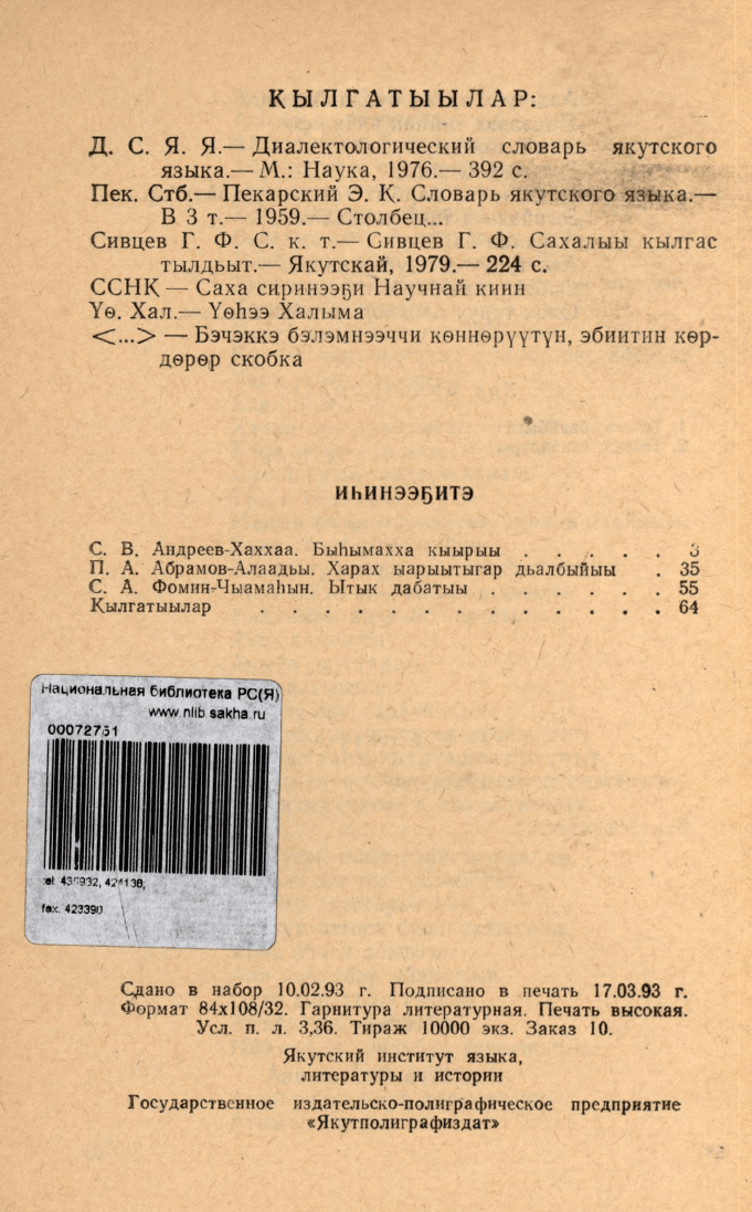 Ойуун : кыырыылар / Россия наукаларын акад., Сиб. салаа, Саха сиринээҕи тыл, лит. уонна история ин-та ; [хомуйан оҥордулар: филол. н. к. Мухоплева С. Д., Рожина Л. Ф.]. - Дьокуускай : Якутполиграфиздат, 1993. - 62, [2] с.