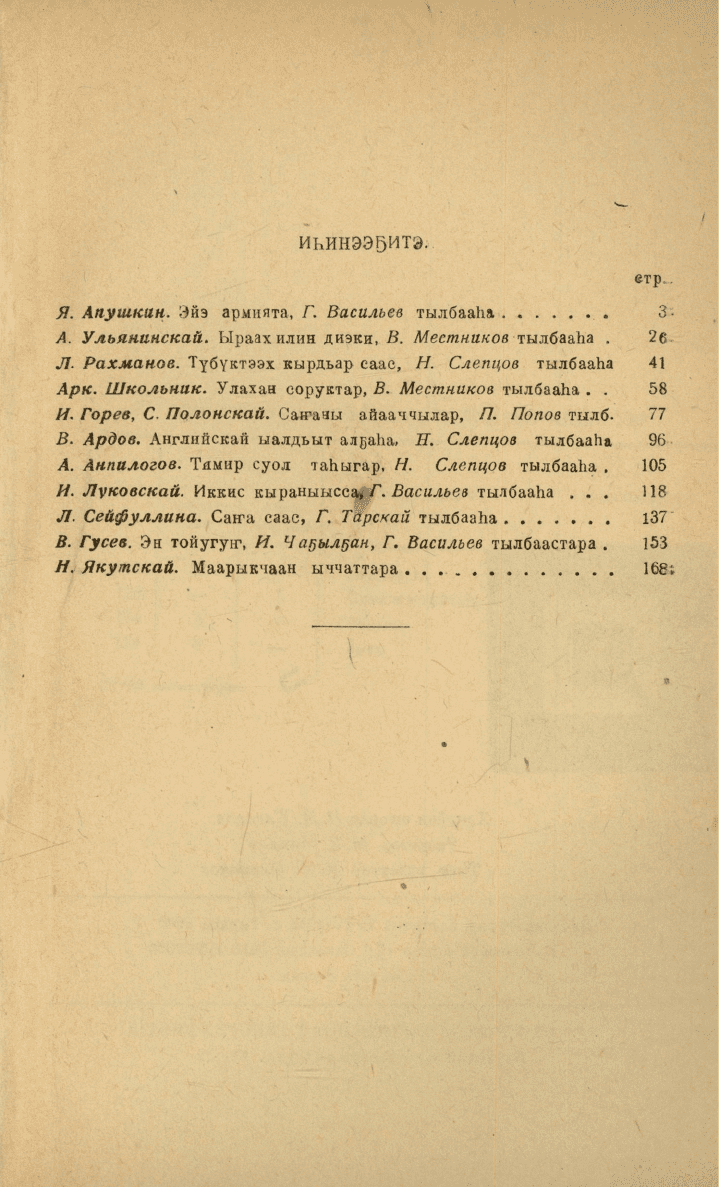 Биһиги театрбыт : кыра формалаах пьесалар / Саха респ. народ айымньытын дьиэтин таһаарыыта ; [хомуйан оҥордо Н. И. Слепцов]. - Якутскай : Саха АССР государственнай изд-вата, 1952. - 189 с.