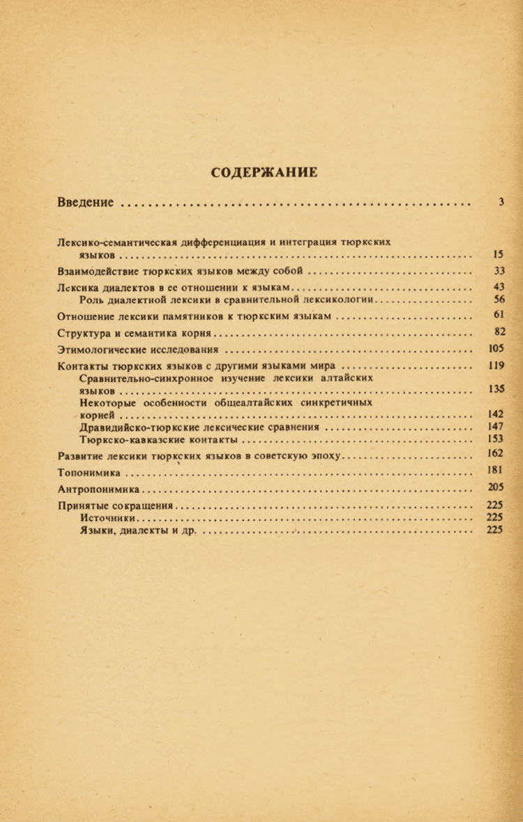 Монография представляет собой исследование лексики тюркских языков в сравнительно-историческом освещении, в ней поставлены основные проблемы современной тюркской синхронной и исторической лексикологии