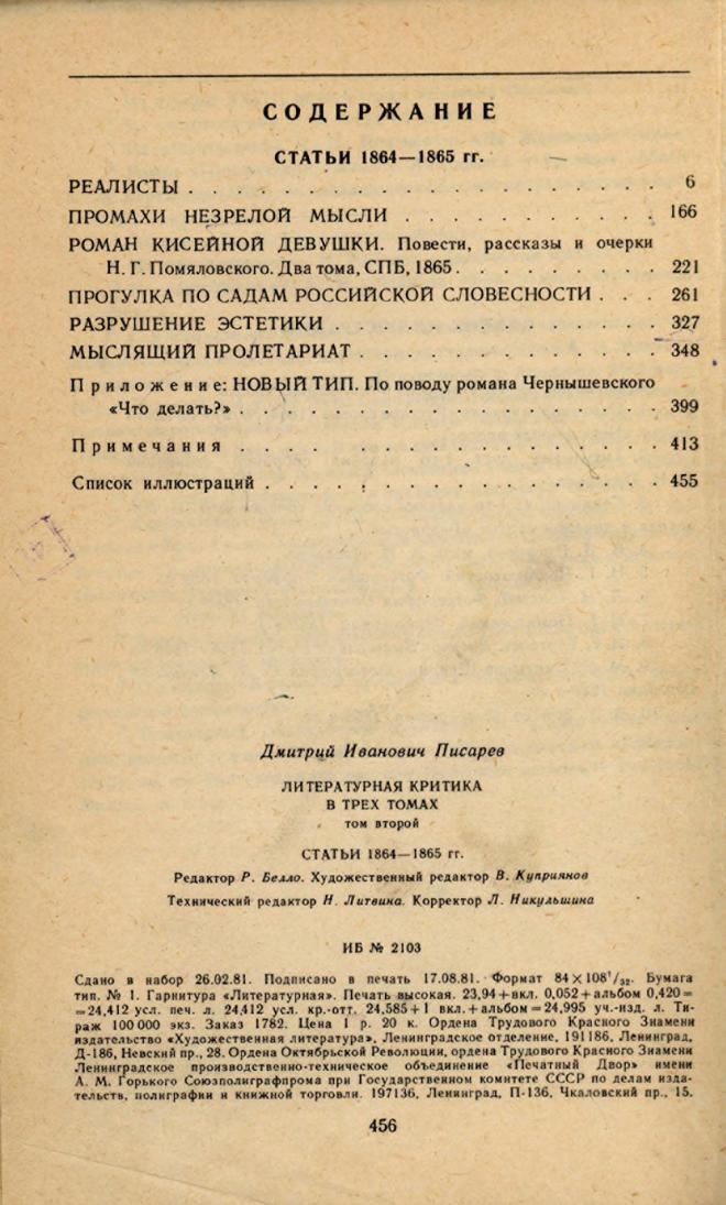 Литературная критика : в 3 т. / Д. И. Писарев ; составление, вступительная статья, подготовка текста и и примечания Ю. С. Сорокина]. - Ленинград : Художественная литература, Ленинградское отделение, 1981. -.Т. 2: Статьи, 1864-1865 гг. - 1981. - 453, [2] с., [5] л. ил., портр. Библиогр. в примеч.