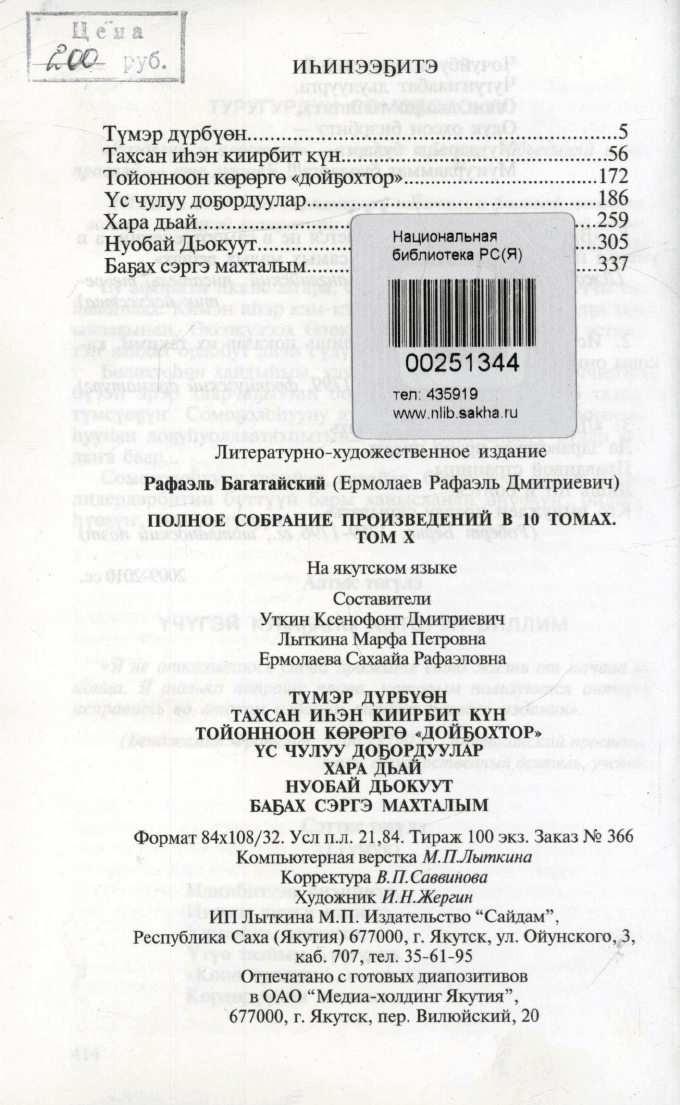 - 1. Баҕатаайыскай Рафаэль. Айымньылар толору хомуурунньуктара: 10 томнаах