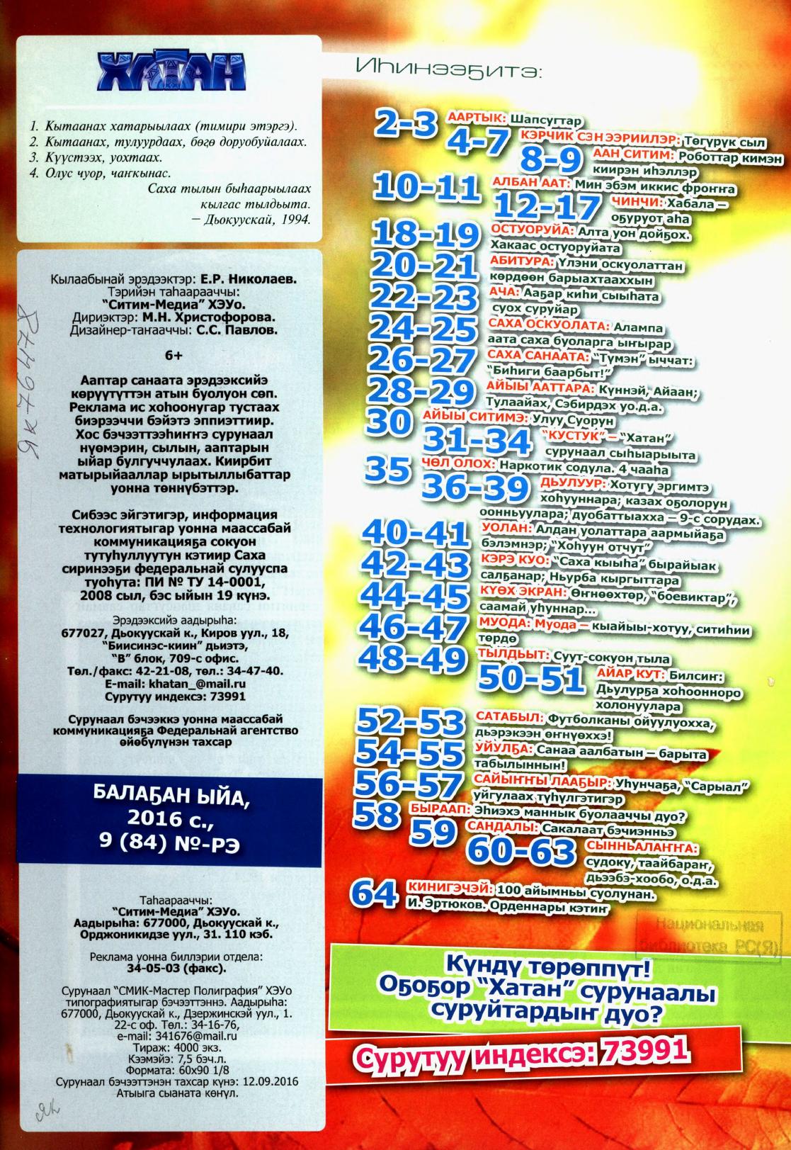 - 62. Хатан: ыччат сайдам сурунаала, 2016, №6 (81) (бэс ыйа)