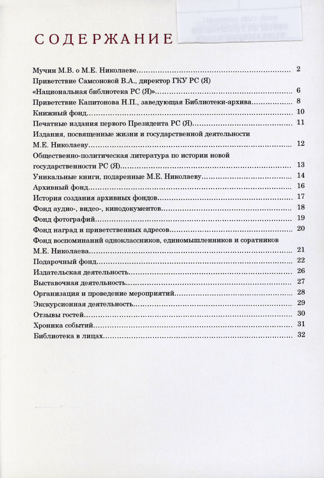 Библиотека-архив Первого Президента Республики Саха (Якутия) Михаила Ефимовича Николаева : 2002-2012 гг. / [автор предисловия: М. Мучин, В. А. Самсонова, Н. П. Капитонова]. - Чапаево : [б. м. и.], 2012 (Якутск : РИЦ НБ РС(Я)). - 36, [1] с.