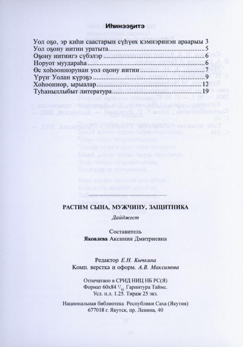 Уол оҕо барахсан : дайджест / Саха Респ. Нац. б-ката, Оҕо уонна ыччат киинэ, Внестационар. отд. ; [хомуйан оҥордо А. Д. Яковлева]. - Дьокуускай : СРИД НИЦ НБ РС(Я), 2018. - 19 с.