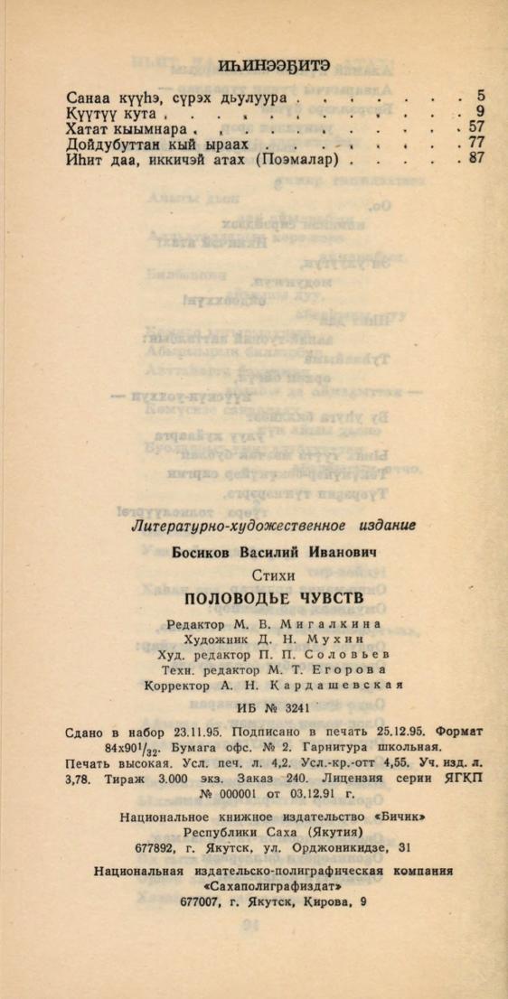 Уолукпар оргуйар санаалар : хоһооннор, поэмалар / Василий Босяк ; Д. Н. Мухин ойуулара. - Дьокуускай : Бичик, 1996. - 96 с.