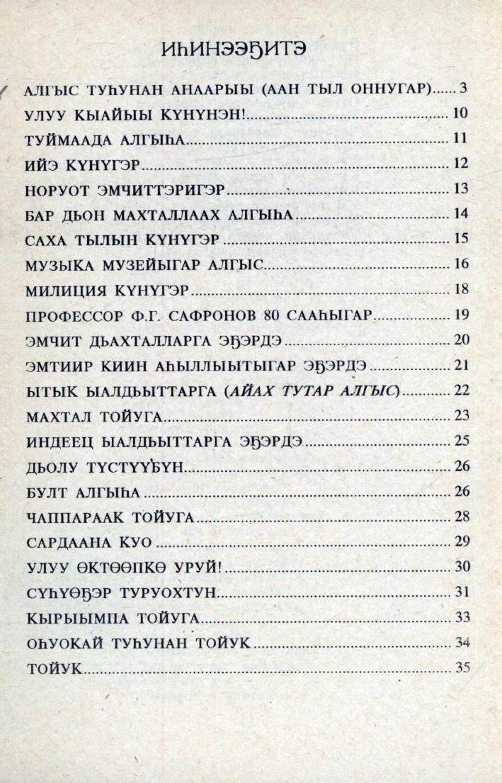 В книгу народного певца, доктора филологических наук Н. Е. Петрова включены его избранные стихи - заклинания, благопожелания, тойуки, созданные и исполненные им в разные годы. Во вступительной статье вкратце говорится о видах культовой поэзии якутов, о происхождении алгысов, о их роли в возникновении некоторых жанров фольклора, которые дали сильный толчок развитию устного поэтического творчества народа саха, дана классификация алгысов