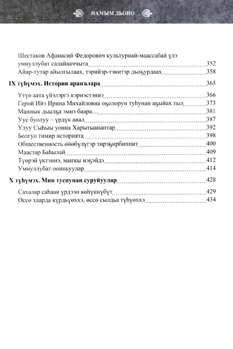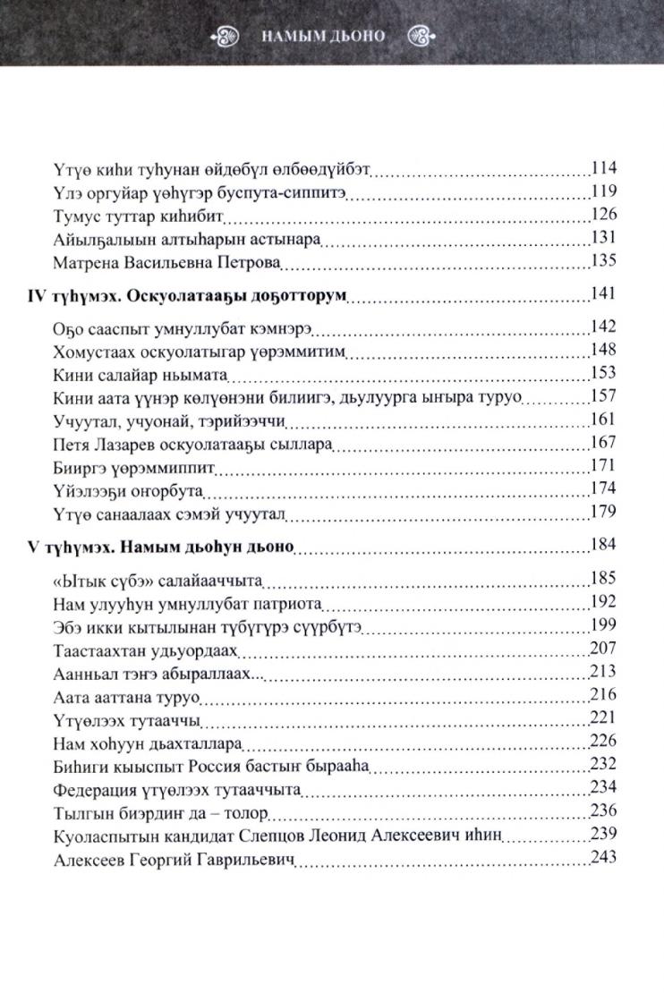 В сборник материалов вошли воспоминания заслуженного работника культуры РСФСР Иннокентия Захаровича Кривошапкина о земляках, деятелях, почетных жителях и коллегах Намского улуса