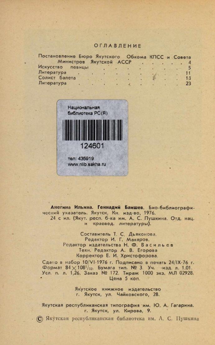 Анегина Ильина, Геннадий Баишев : био-библиографический указатель / Якутская республиканская библиотека им. А. С. Пушкина, Отдел национальной и краеведческой литературы ; [составитель Т. С. Дьяконова ; авторы вступительных статей: Г. Кривошапко, Н. Посельская-Неустроева]. - Якутск : Якутское книжное издательство, 1976. - 21, [3] с.