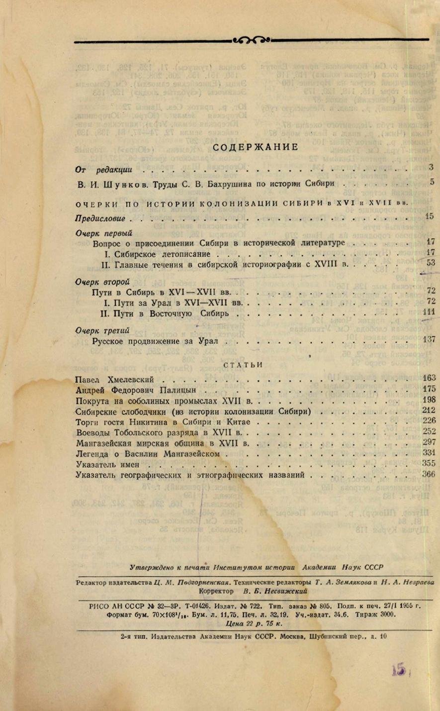 Научные труды / С. В. Бахрушин ; [редкол.: А. А. Зимин и др.] ; Акад. наук СССР, Ин-т истории. - Москва : Изд-во Академии наук СССР, 1952-1959. - 27 см. Т. 3, Ч. 1: Избранные работы по истории Сибири ХVI-ХVII вв., Ч.1. Вопросы русской колонизации Сибири в ХVI-ХVII вв. - 1955. - 375, [1] с. Библиогр. в подстроч. примеч. - Указ.