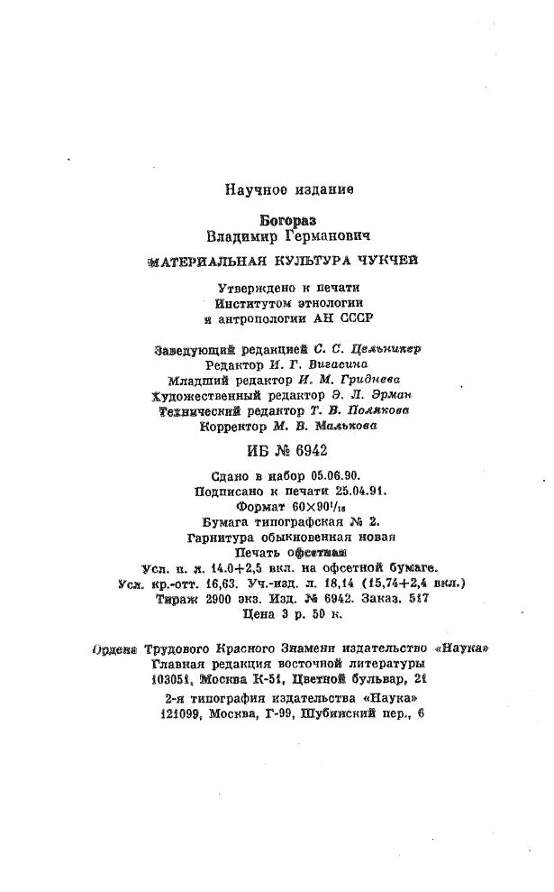 Книга Владимира Германовича Богораза «Материальная культура чукчей», опубликованная Академией наук СССР, посвящена традиционному образу жизни коренных народов Чукотки — чукчей и коряков. Рассматриваются основные направления хозяйственной деятельности северных народов, включающие: