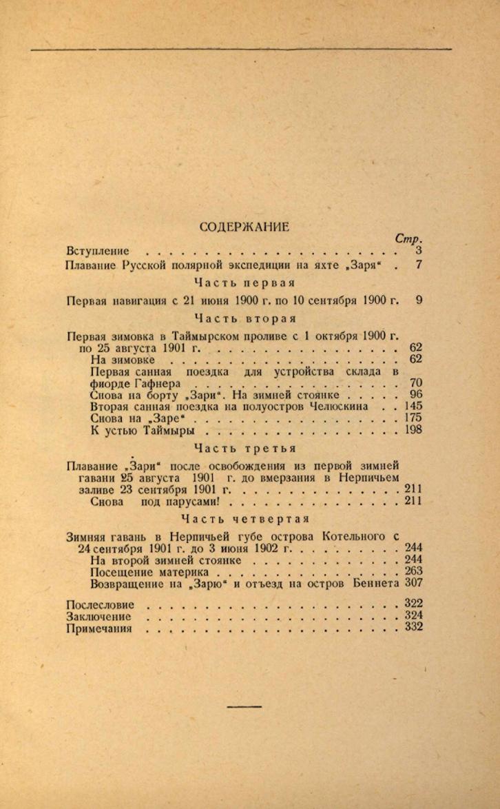 Плавание на яхте "Заря" / Э. В. Толль ; перевод с немецкого З. И. Виттенбург ; под редакцией, [автор предисловия П. В. Виттенбурга ; художник Б. В. Шварц]. - Москва : Географгиз, 1959. - 339 с. - 20000 экз. Э. Толль - известный русский полярный исследователь - в форме дневника повествует о своей экспедиции, снаряженной русской Академией паук в 1900 г. для исследования Таймыра и на поиски легендарной Земли Санникова. В дневнике он говорит о своих спутниках, делится чувствами и мыслями, описывает наиболее интересные события из жизни двухлетней экспедиции и рассказывает о громадной научной работе, проделанной ею.
