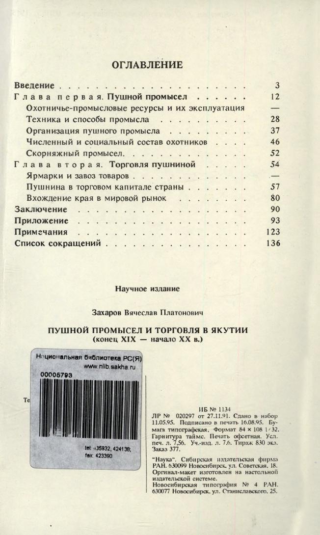 Пушной промысел и торговля в Якутии (конец 19- начало 20 в) / АН Респ. Саха (Якутия), Ин-т яз.,лит. и истории ; Отв. ред. В.Н.Иванов. - Новосибирск : Наука, 1995. - 137 с. ISBN 5-02-030884-6.