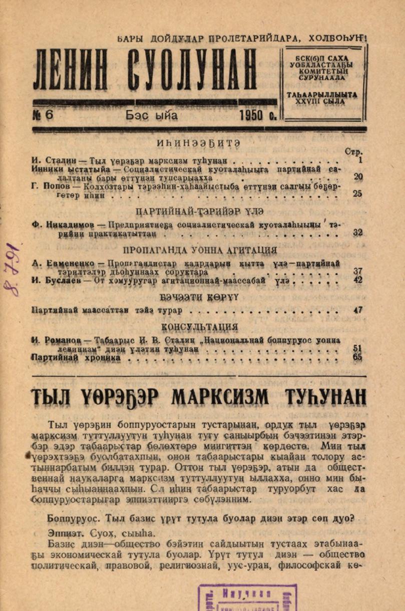 - 1. Ленин суолунан: БСК(б)П Саха сиринээҕи обкомун сурунаала, 1950, №1 (тохсунньу)