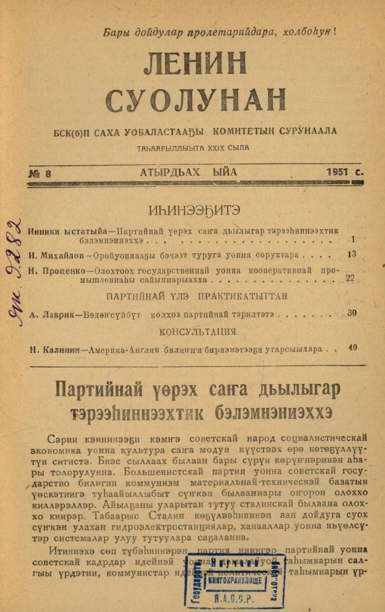 - 1. Ленин суолунан: БСК(б)П Саха сиринээҕи обкомун сурунаала, 1951, №1 (тохсунньу)
