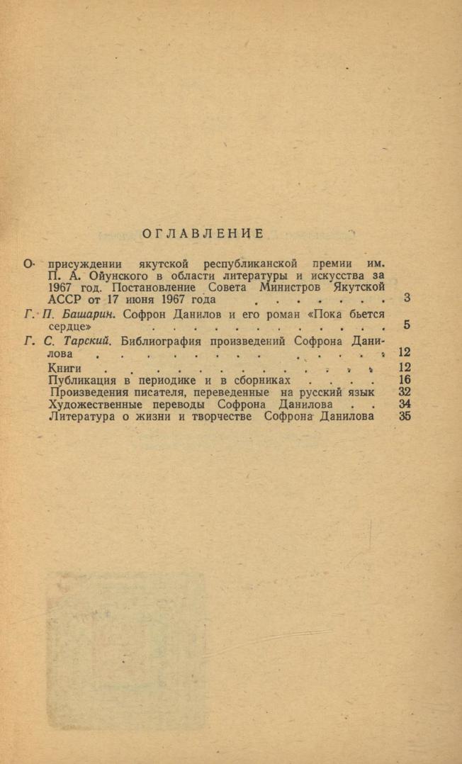 Софрон Данилов : Био-библиографический указатель / составители Г. П. Башарин, Г. С. Тарский; под редакцией З. Т. Тюнгюрядова ; Якут. респ. б-ка им. А.С.Пушкина. - Якутск : Якутское книжное издательство, 1969. - 44 с.