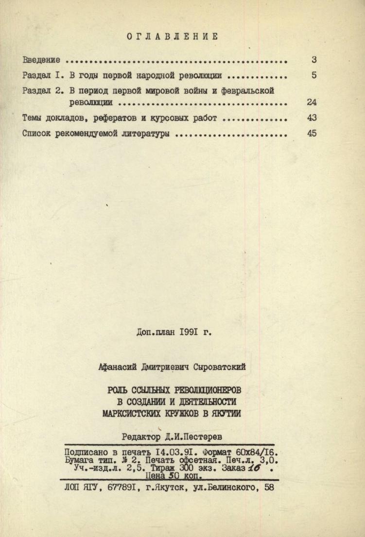 Роль ссыльных революционеров в создании и деятельности марксистских кружков в Якутии : учебное пососбие / А. Д. Сыроватский ; Государственный комитет РСФСР по делам науки и высшей школе, Якутский государственный университет им. М. К. Аммосова. - Якутск : [б. и.], 1991. - 47, [1] с.