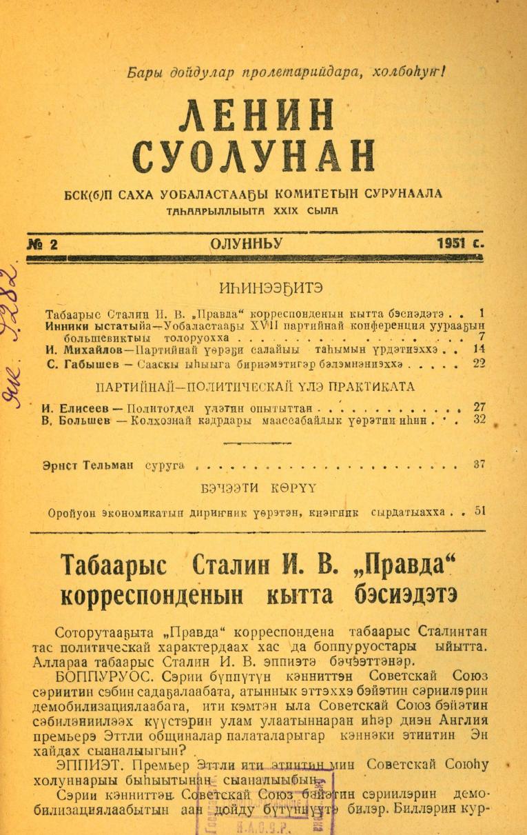 - 1. Ленин суолунан: БСК(б)П Саха сиринээҕи обкомун сурунаала, 1951, №1 (тохсунньу)
