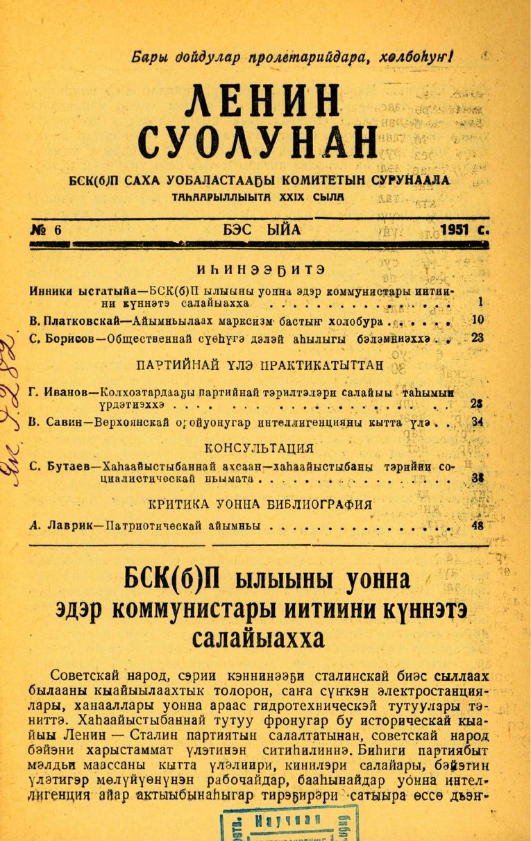- 1. Ленин суолунан: БСК(б)П Саха сиринээҕи обкомун сурунаала, 1951, №1 (тохсунньу)
