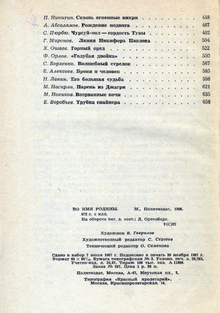Во имя Родины : [очерки] / составитель генерал-майор Д. Оренберг ; редактор Л. Филатова : [предисловие А. Гречко]. - Москва : Политиздат, 1968. - 672 с., [6] л. портр.