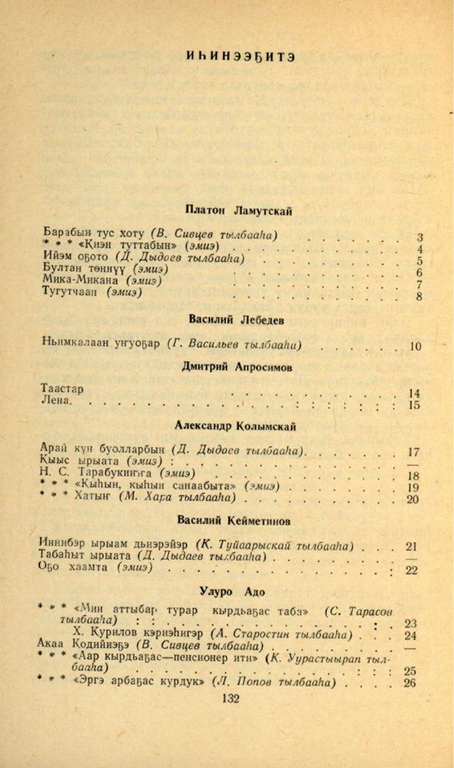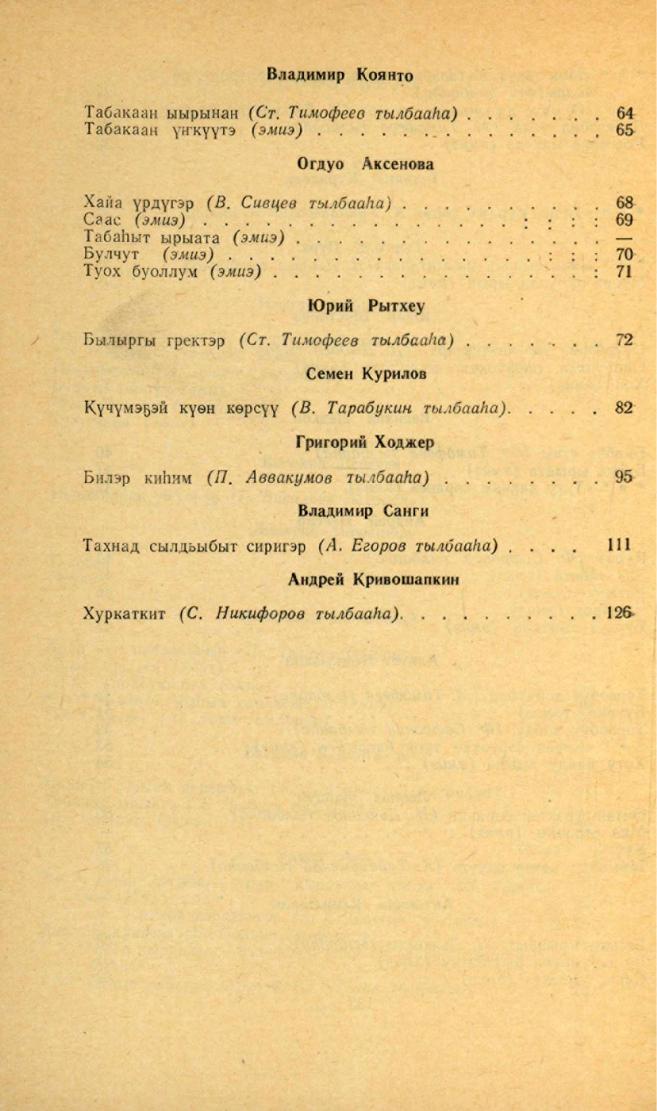 Доҕордоһуу түһүлгэтэ : (хотугу норуоттар суруйааччыларын хомуурунньуктара) / составители: Г. Н. Курилов-Улуро Адо, П. Д. Аввакумов. - Якутск : Книжное издательство, 1974. - 133, [1] с. Содерж.авт.