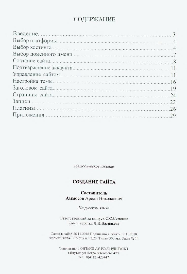 Создание сайта : (методическое издание) / Автономное учреждение Республики Саха (Якутия) "Республиканский Дом народного творчества и социально-культурных технологий" ; составитель А. Н. Аммосов. - Якутск : АУ РС(Я) РДНТ и СКТ, 2018. - 35 с.