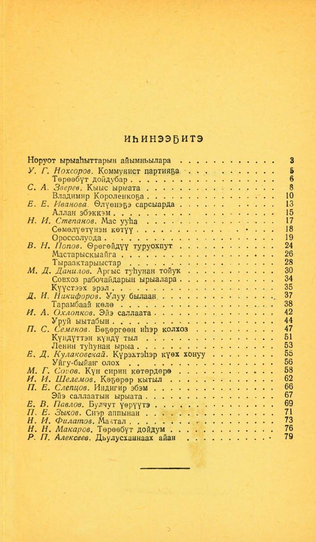 Уйгулаах олоҕу уруйдуубут : норуот ырыаһыттарын айымньылара / Саха АССР культуратын м-вота, Норуот айымньытын дьиэтэ ; [сост., авт. предисл. П. Н. Попов]. - Якутскай : Саха сиринээҕи кинигэ издательствота, 1960. - 81, [1] с.