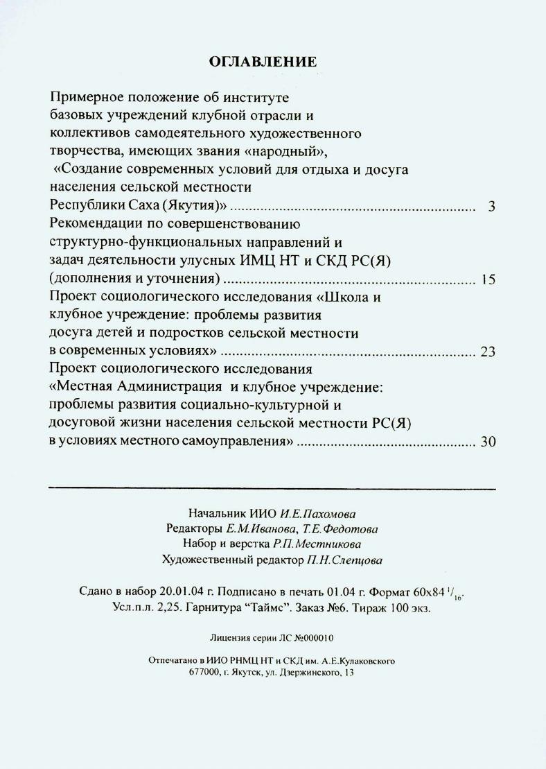 Рекомендации в помощь работе отделов (секторов) улусных ИМЦ НТ и СКД Республики Саха (Якутия) / Республиканский научно-методический Центр народного творчества и социально-культурной деятельности им. А. Е. Кулаковского ; автор проекта и составитель Хон С. В. - Якутск : РНМЦ НР и СКД им. А. Е. Кулаковского, 2004. - 36 с. ).