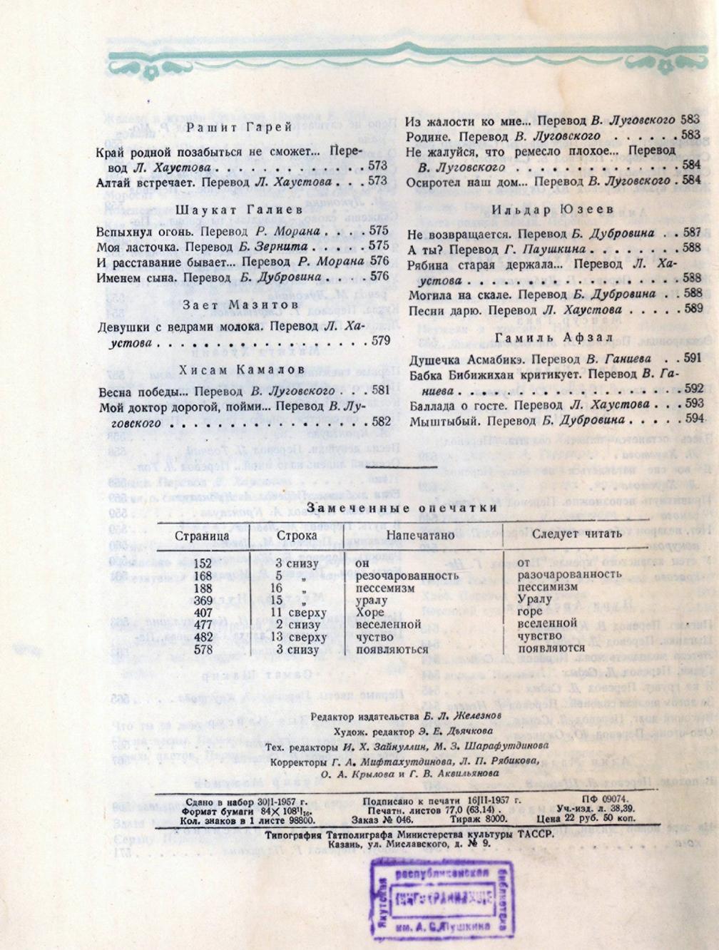Антология татарской поэзии : [перевод с татарского] / составитель Михаил Львов ; редакторы переводов: Николай Сидоренко, Сибгат Хаким. - Казань : Таткнигоиздат, 1957. - 605, [1] с.