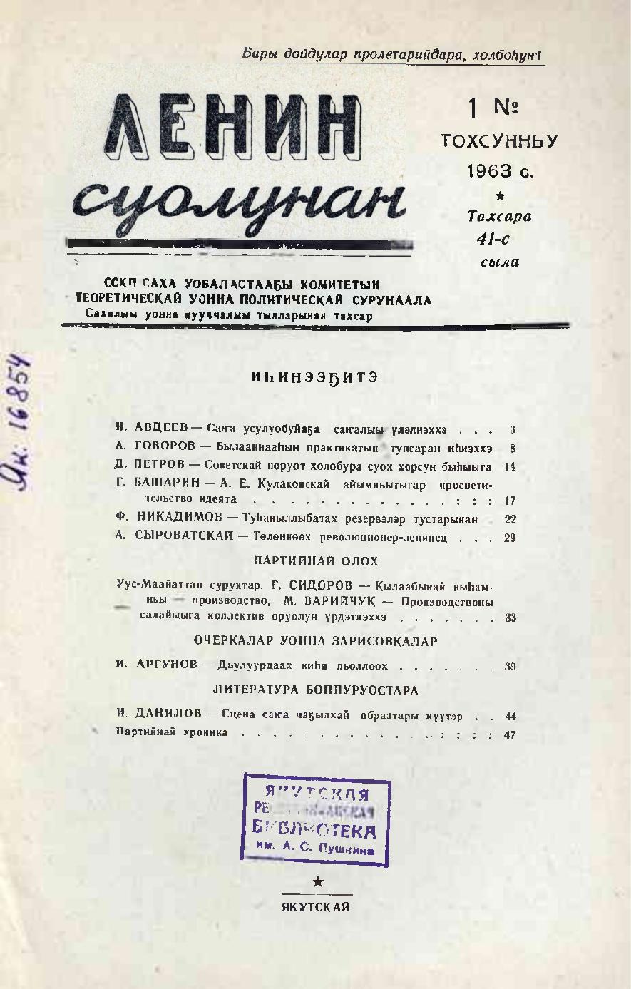 - 1. Ленин суолунан: БСК(б)П Саха сиринээҕи обкомун сурунаала, 1963, №2 (олунньу)