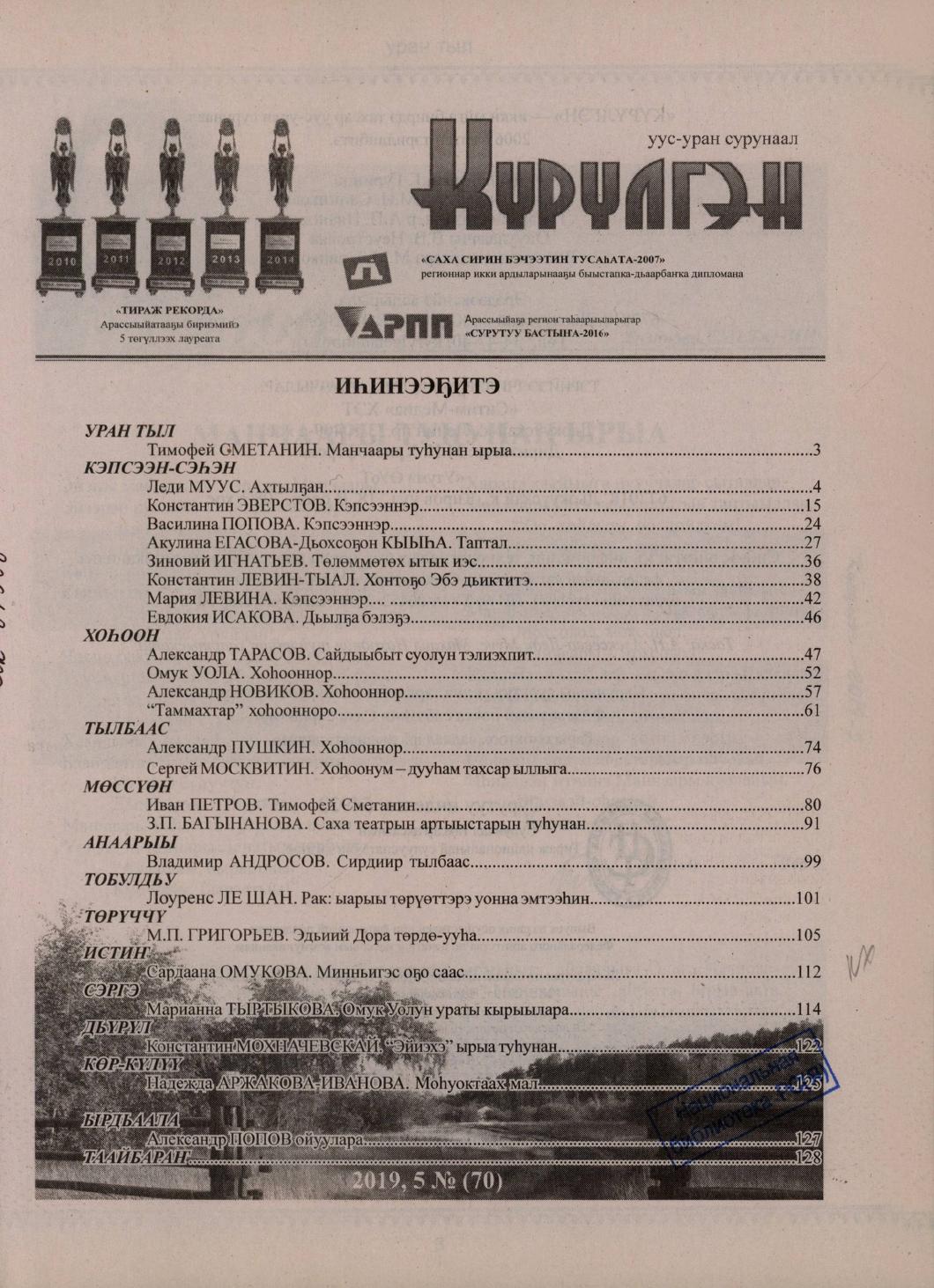 - Периодические издания Якутии (конец XIX – XXI вв.) > Журналы > «Күрүлгэн»: уус-уран сурунаал > 2019,