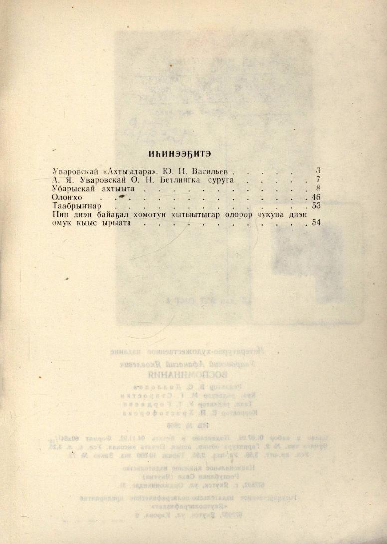 Ахтыылар : олоҥхо, таабырыннар, Пин диэн байаҕал хомотун кытыытыгар олорор чукуна диэн омук кыыс ырыата / А. Я. Уваровскай ; [хомуйан оҥордо, киирии тылы суруйда Ю. И. Васильев ; редактор В. С. Доллонов]. - Дьокуускай : Саха Республикатын Наиональнай кинигэ издательствота, 1992. - 52, [3] с.