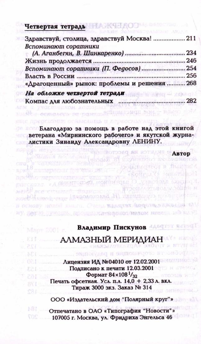 Алмазный меридиан / Владимир Пискунов ; ответственный редактор А. С. Чертков. - Москва : Издательский дом "Полярный круг", 2001. - 285, [3] с.