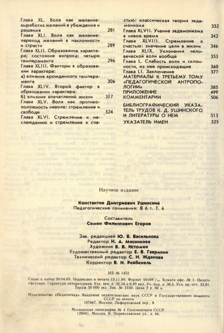 Педагогические сочинения : [в 6 т.] / К. Д. Ушинский ; редкол.: М. И. Кондаков (гл. ред.) и др. ; [вступительная статья, составление и примечание С. Ф. Егорова] ; АПН СССР. - Москва : Педагогика, 1988-1990. - 21 см. - 50000 экз. Т. 6. - 1990. - 528 с., [4] л. ил.
