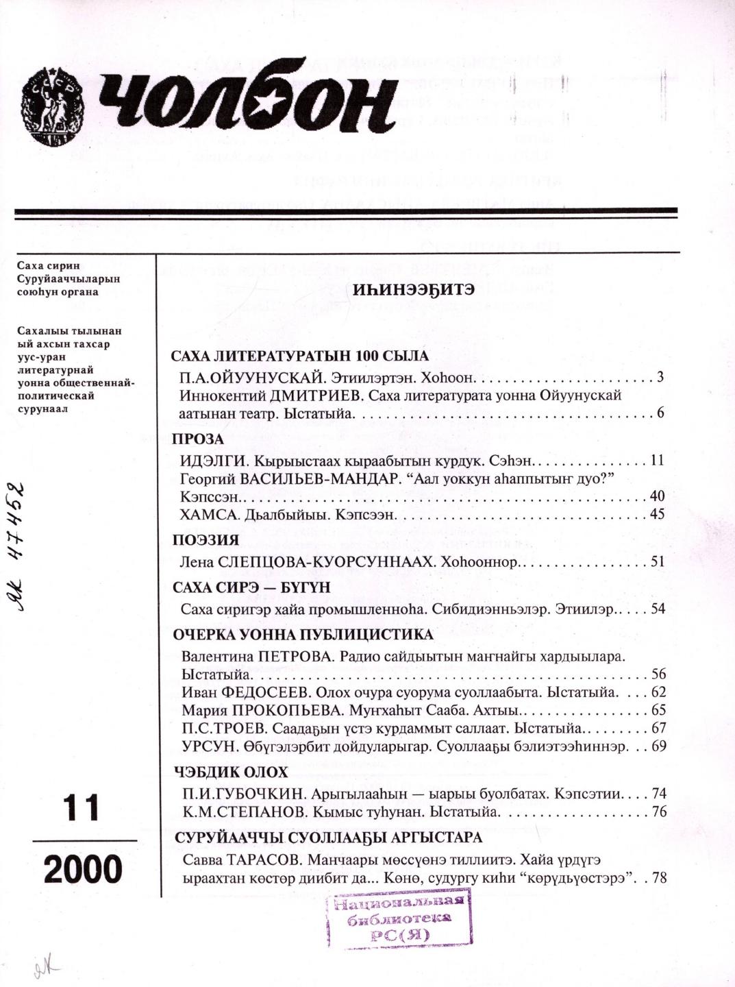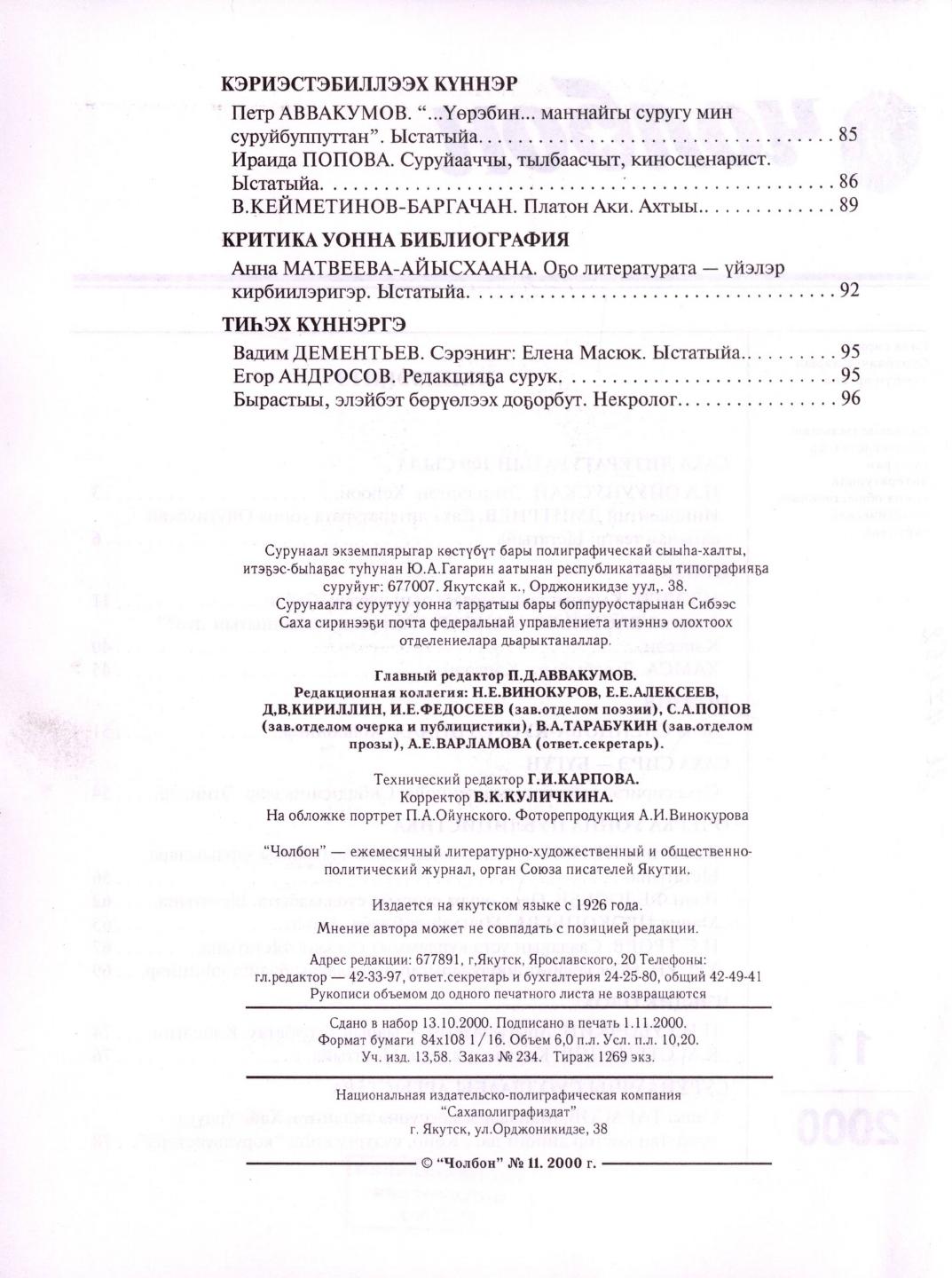 - 2. Чолбон: уус-уран литературнай уонна общественнай-политическай сурунаал, 2000, №2