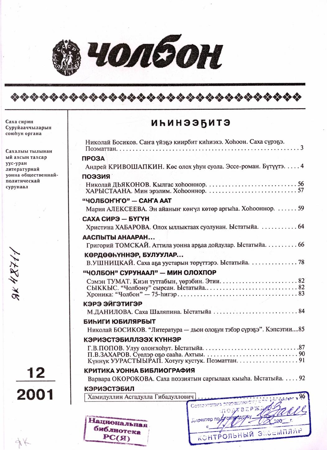 - 2. Чолбон: уус-уран литературнай уонна общественнай-политическай сурунаал, 2001, №2