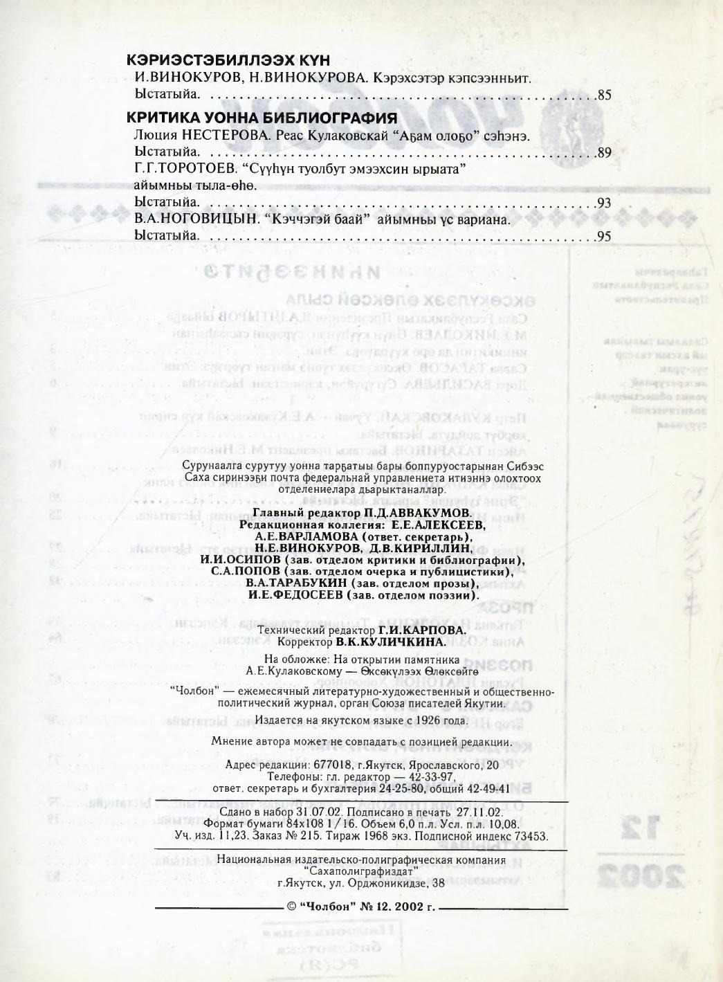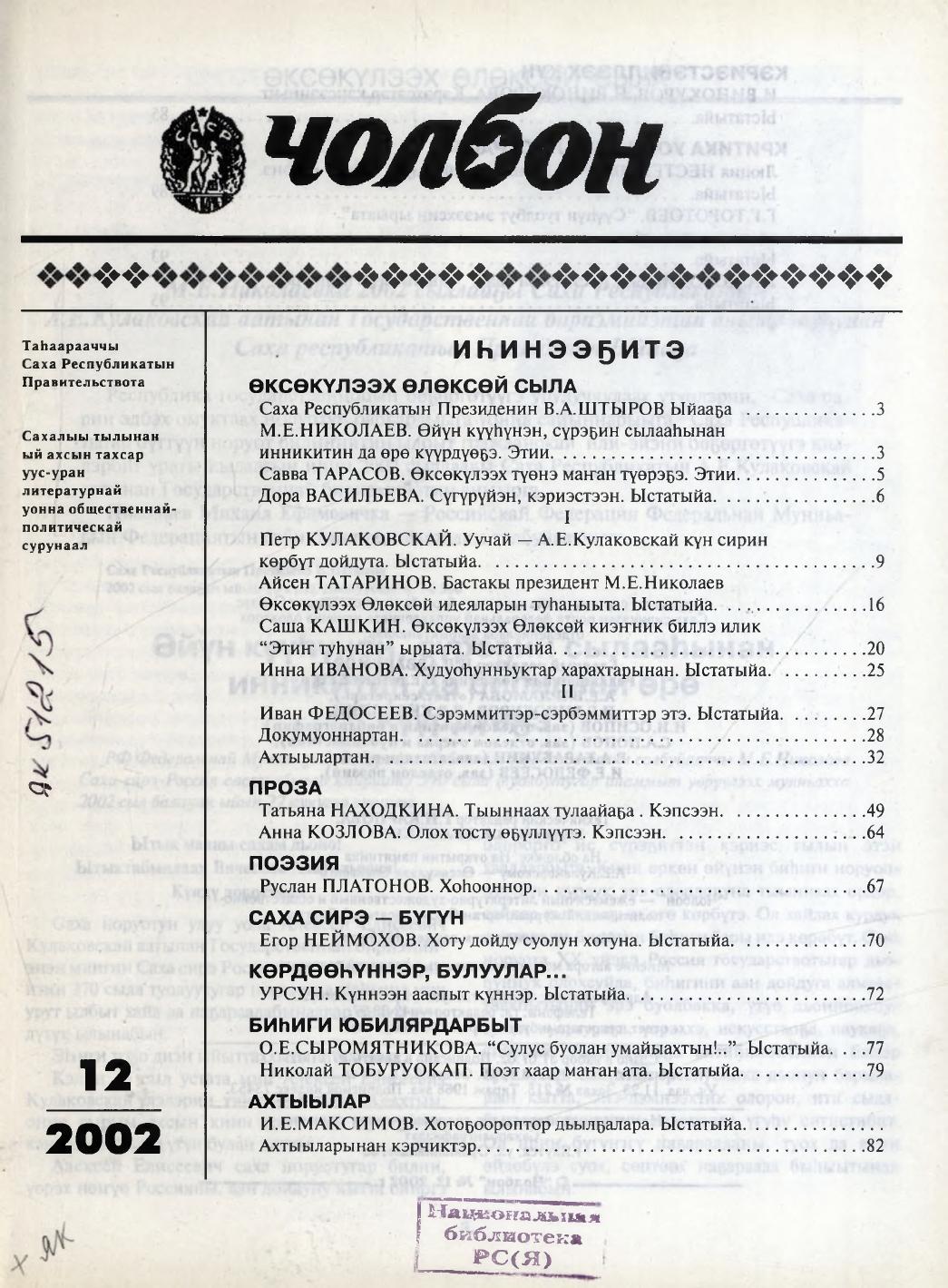 - 2. Чолбон: уус-уран литературнай уонна общественнай-политическай сурунаал, 2002, №2