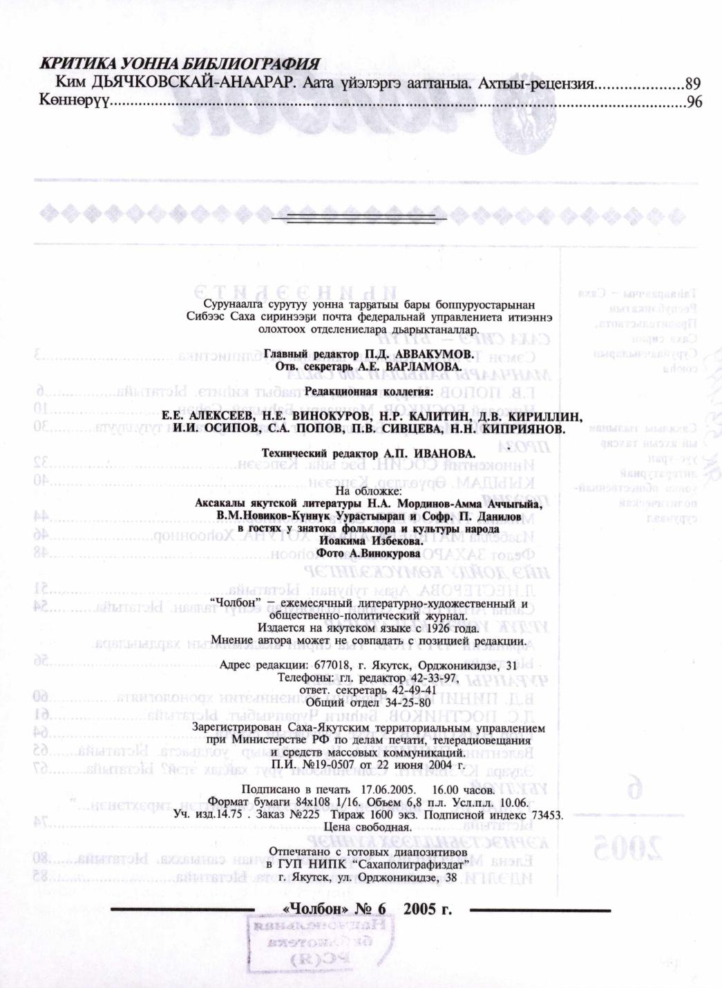 - 2. Чолбон: уус-уран литературнай уонна общественнай-политическай сурунаал, 2005, №2