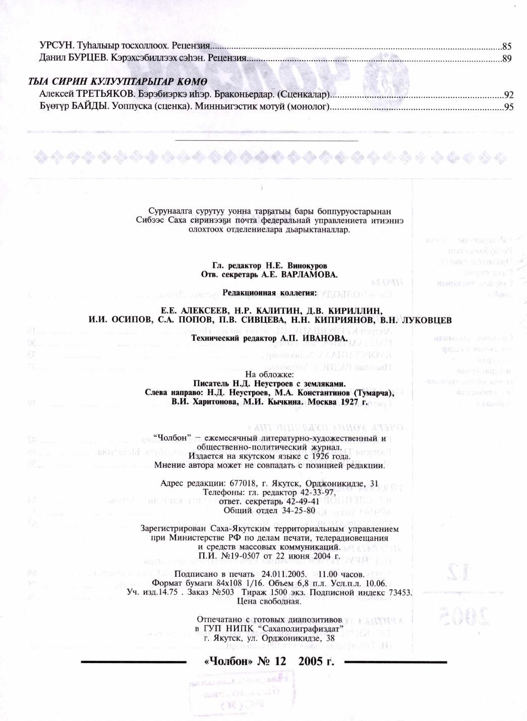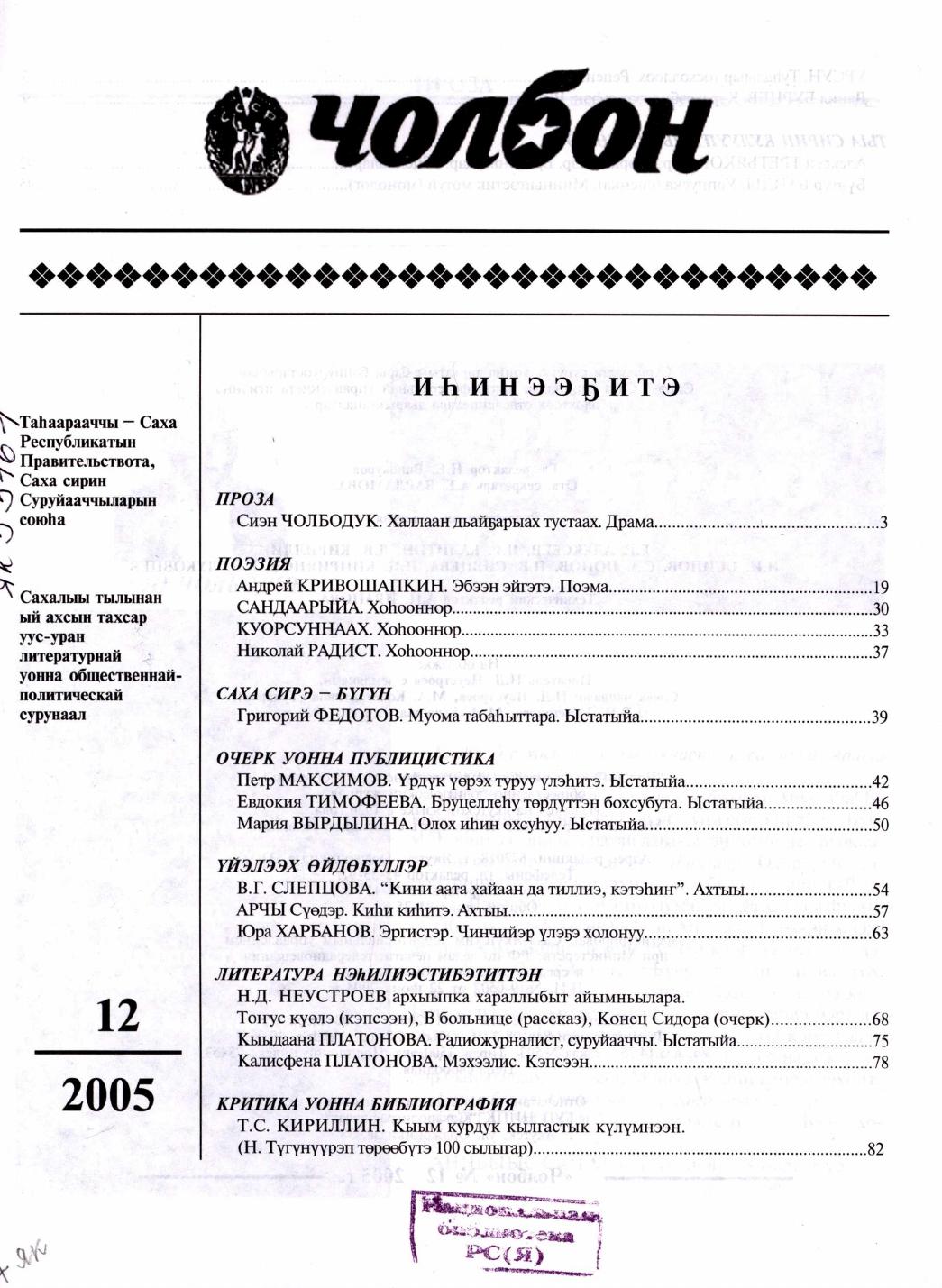 - 2. Чолбон: уус-уран литературнай уонна общественнай-политическай сурунаал, 2005, №2