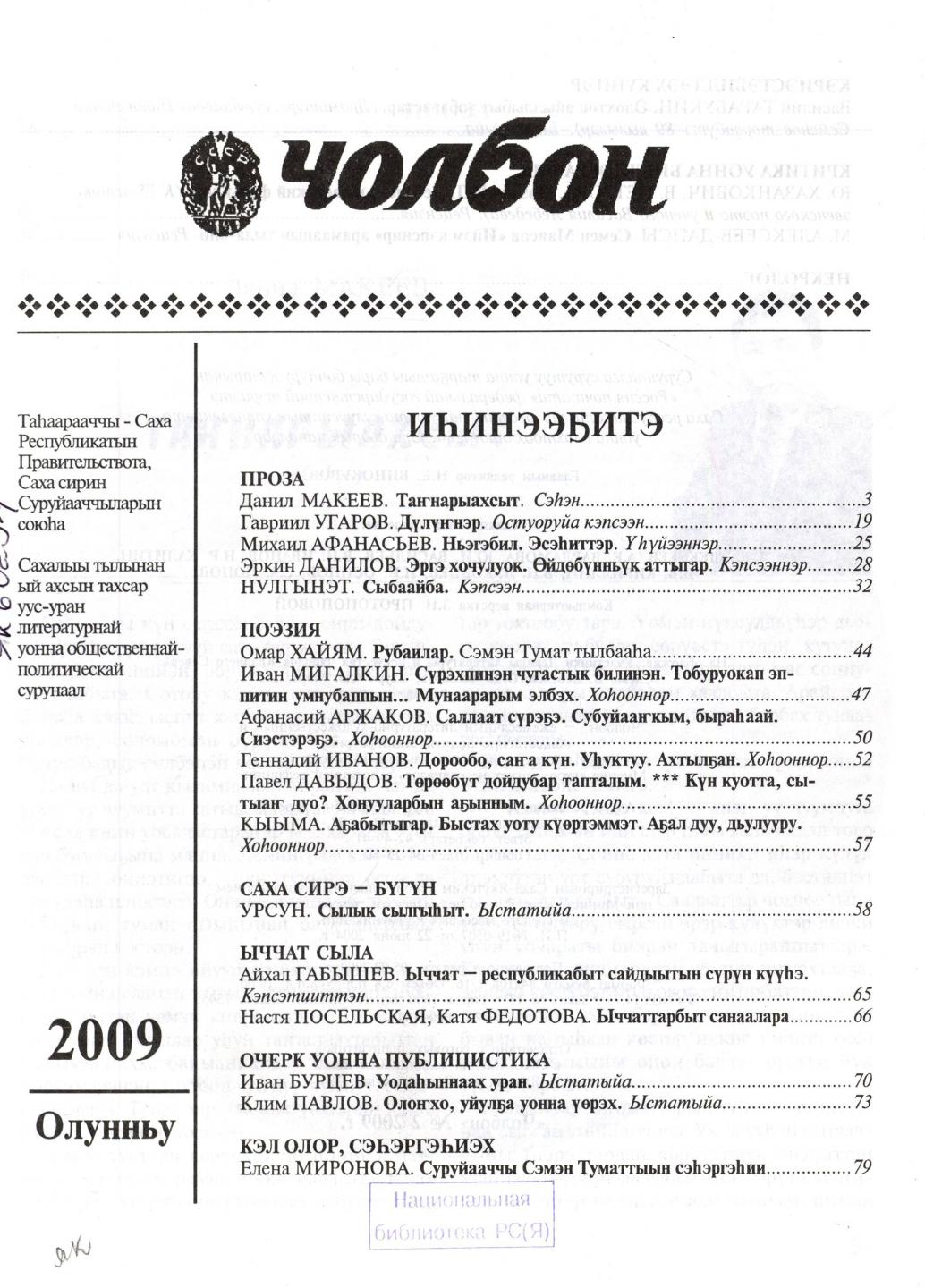 - 1. Чолбон: уус-уран литературнай уонна общественнай-политическай сурунаал, 2009, №1