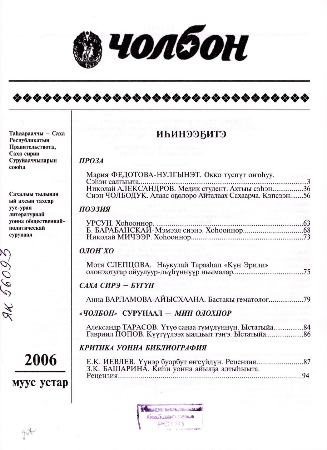 - 2. Чолбон: уус-уран литературнай уонна общественнай-политическай сурунаал, 2006, №2