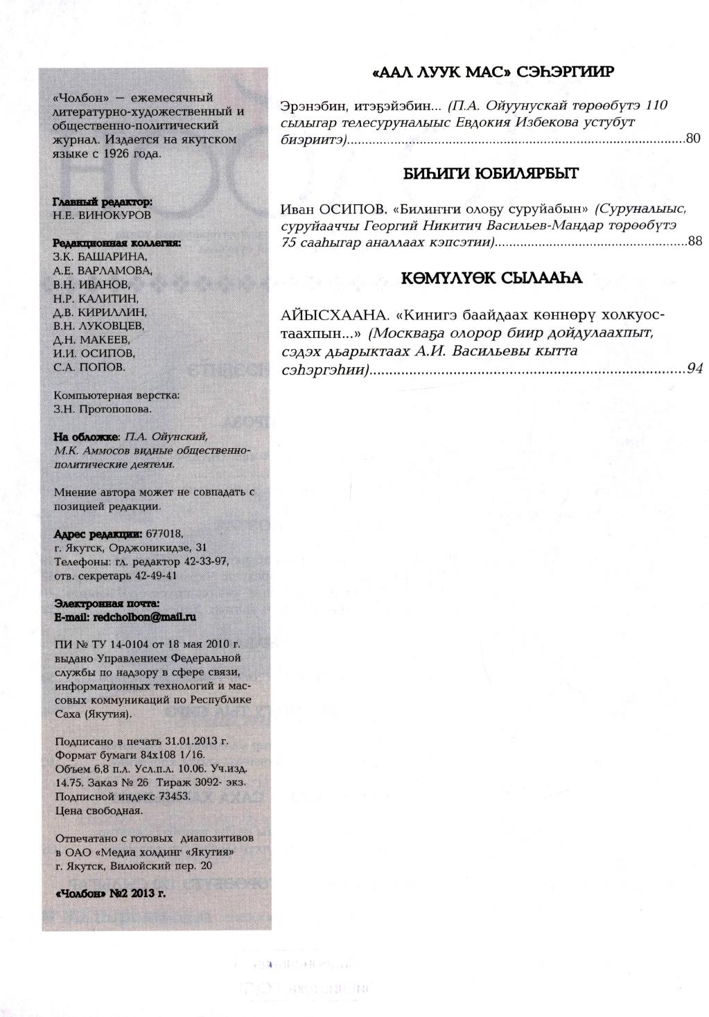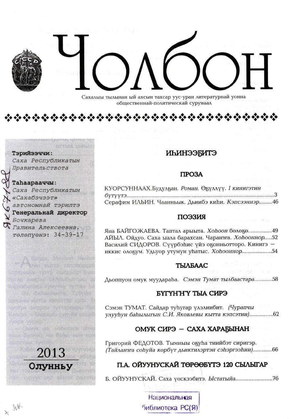 - 1. Чолбон: уус-уран литературнай уонна общественнай-политическай сурунаал, 2013, №1 (тохсунньу)